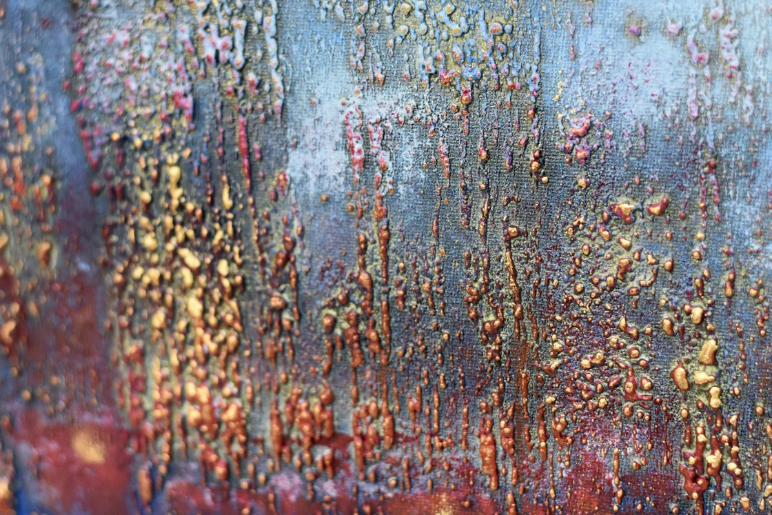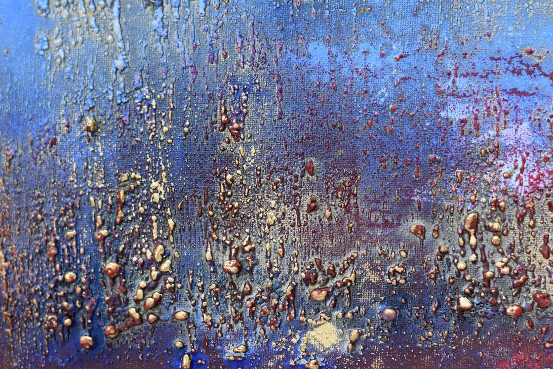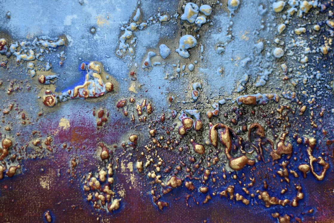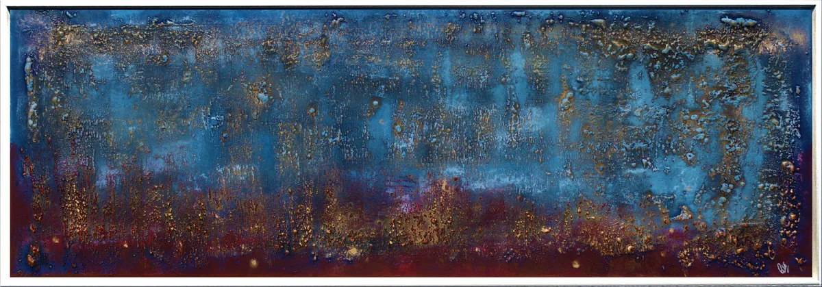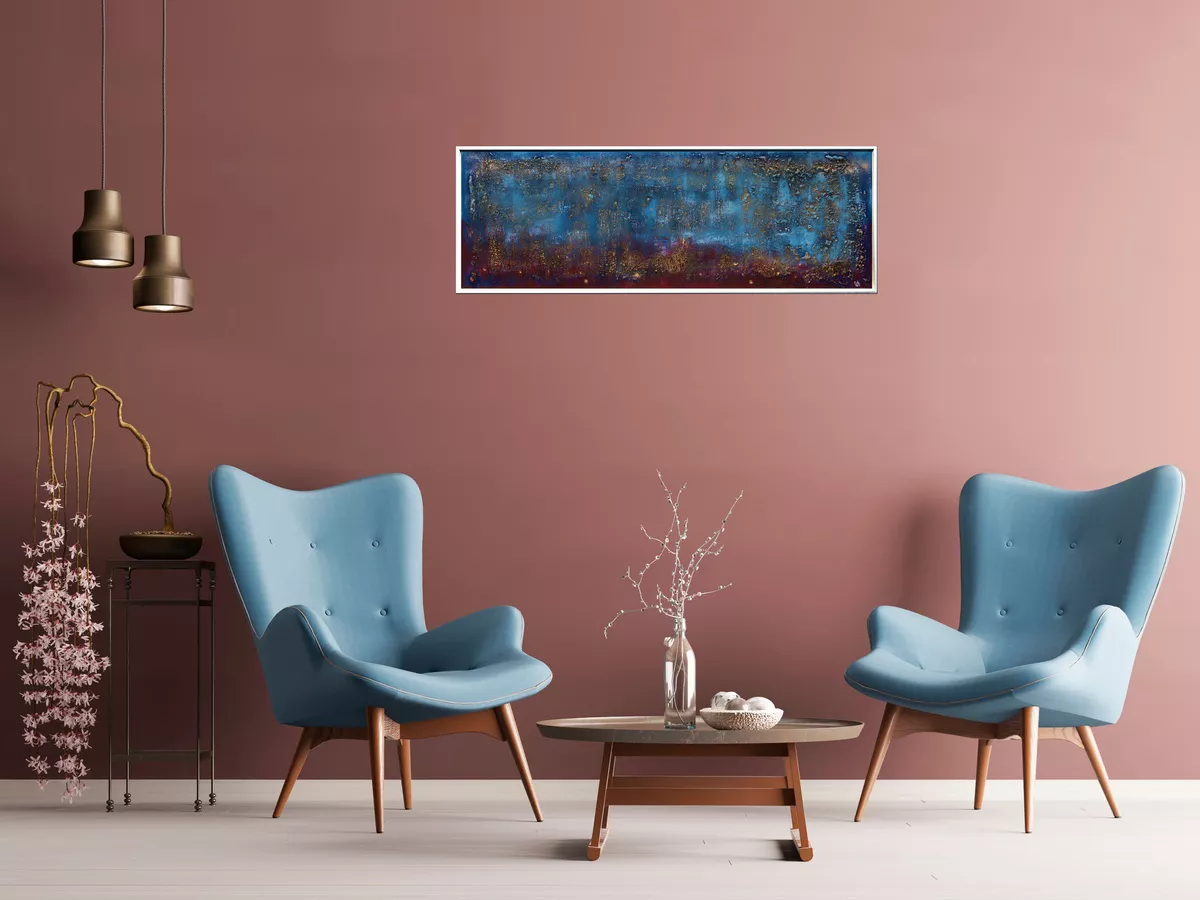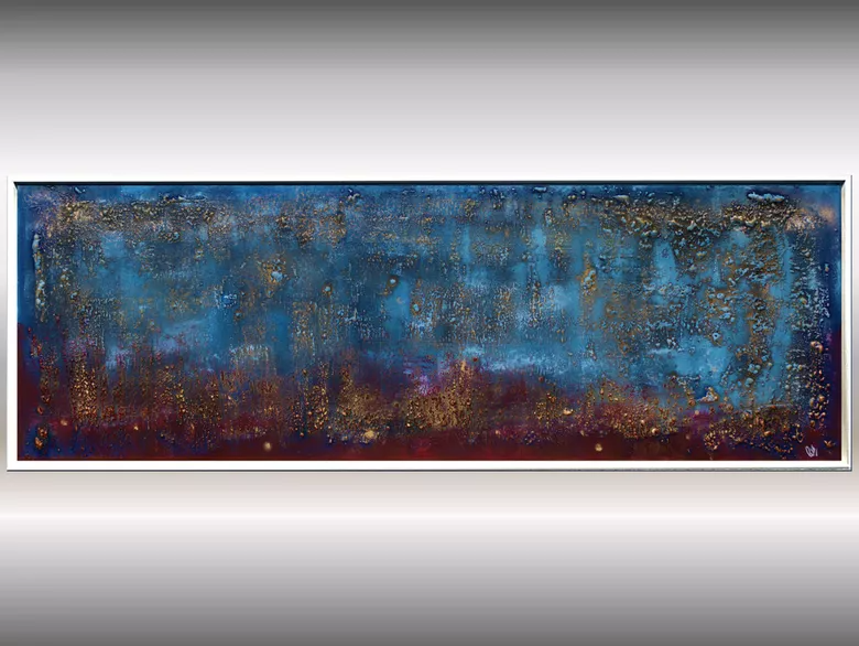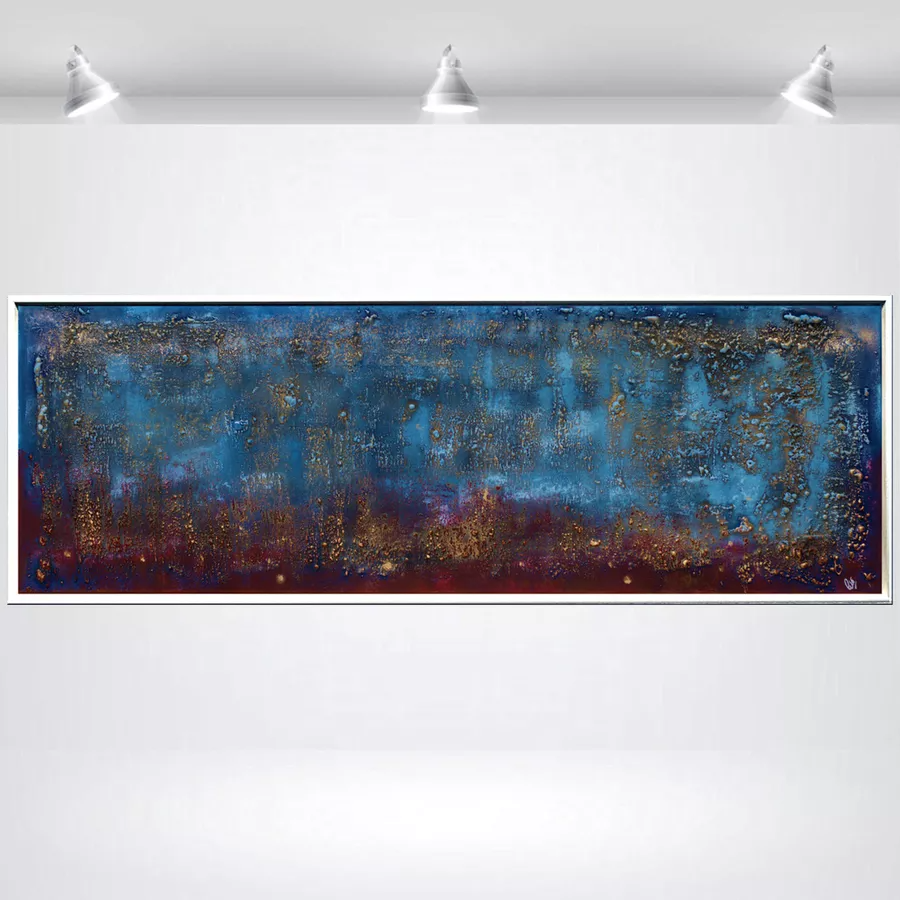This original abstract painting by Edelgard Schroer features a deeply textured surface that shifts between cool blue tones, warm burgundy red, and shimmering gold. The layered acrylic structure creates a rich atmospheric depth, reminiscent of glowing horizons, weathered patina, or distant landscapes seen through mist. Light subtly settles on the raised textures, making the artwork change character depending on the viewing angle. Framed in a white wooden floater frame, this piece offers a bold contemporary presence and brings both elegance and intensity to any interior.