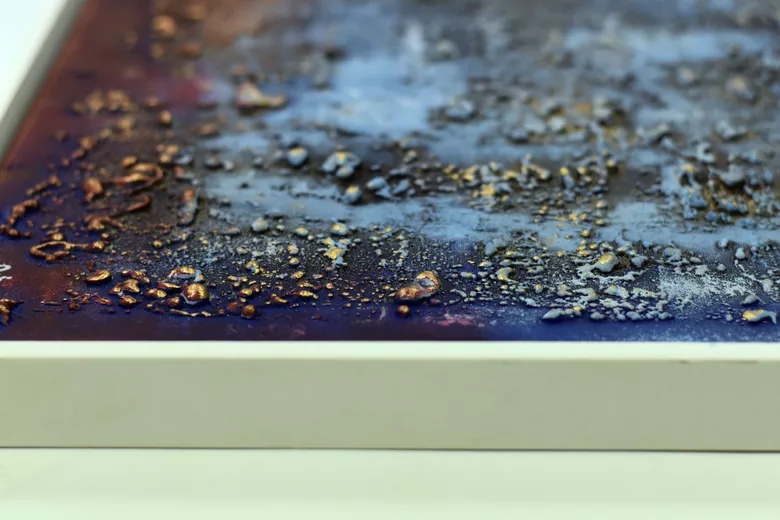 texture, acrylic paints, varnish, white wooden floater frame