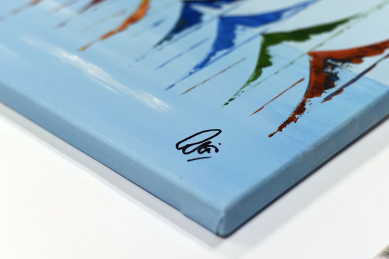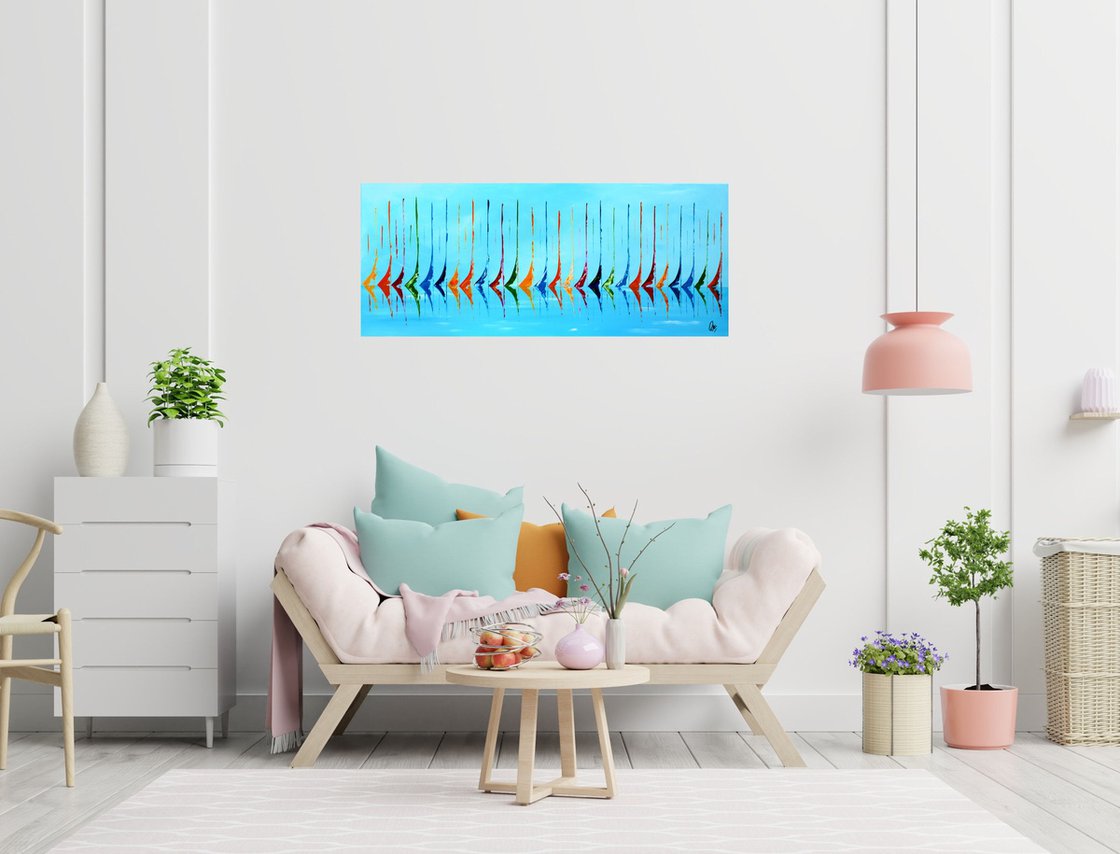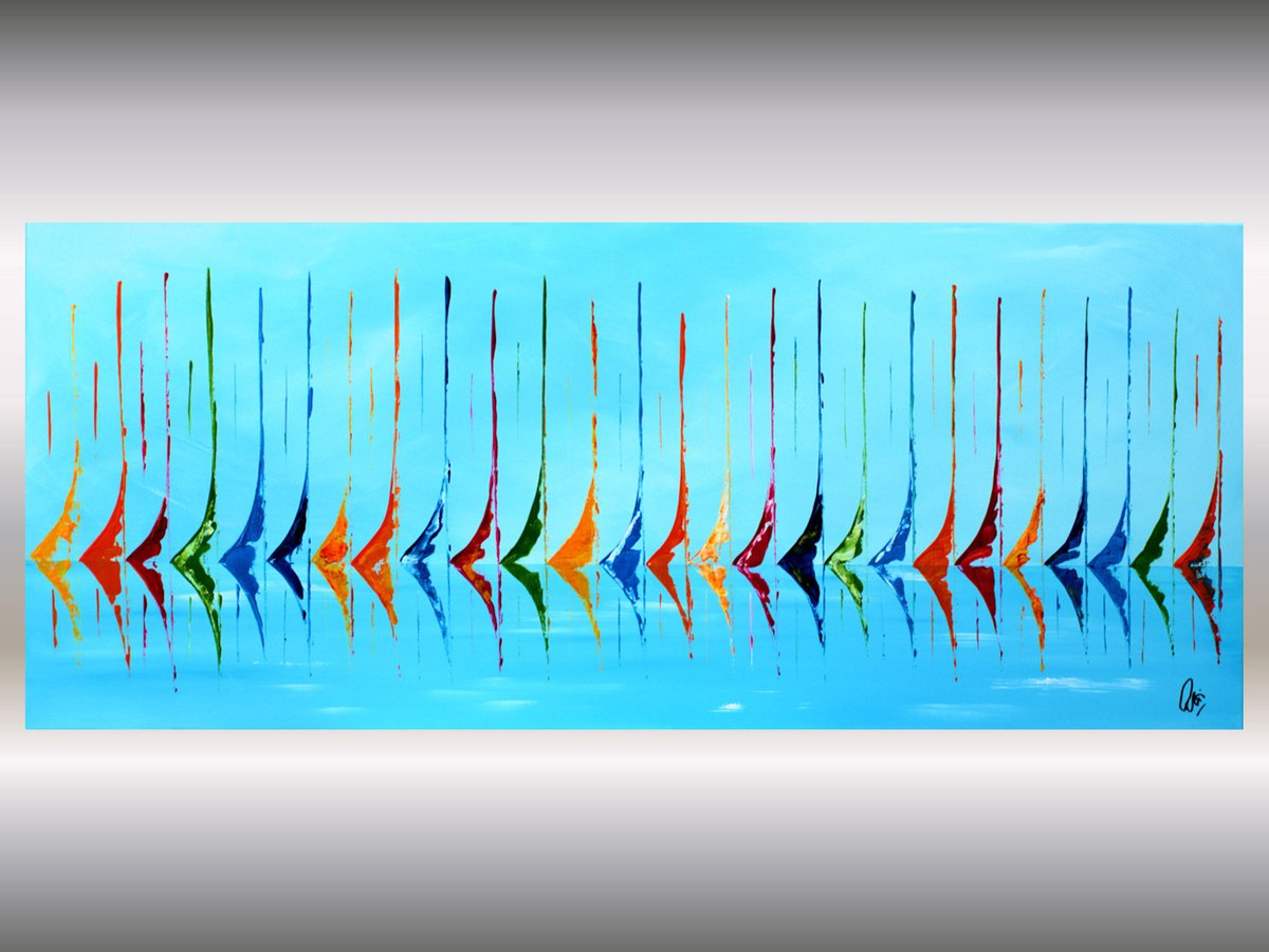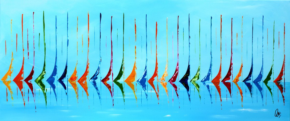 This original acrylic painting by Edelgard Schroer captures a vibrant fleet of abstract sailboats gliding across a calm, turquoise sea. Bold strokes of red, orange, green, and blue rise like sails in the wind, their mirrored reflections shimmering on the water’s surface. The rhythmic repetition of shapes creates a harmonious visual melody, evoking the freedom and joy of sailing under clear skies. Painted on stretched canvas without a frame, the artwork is signed on the front and arrives ready to hang.