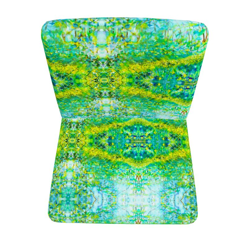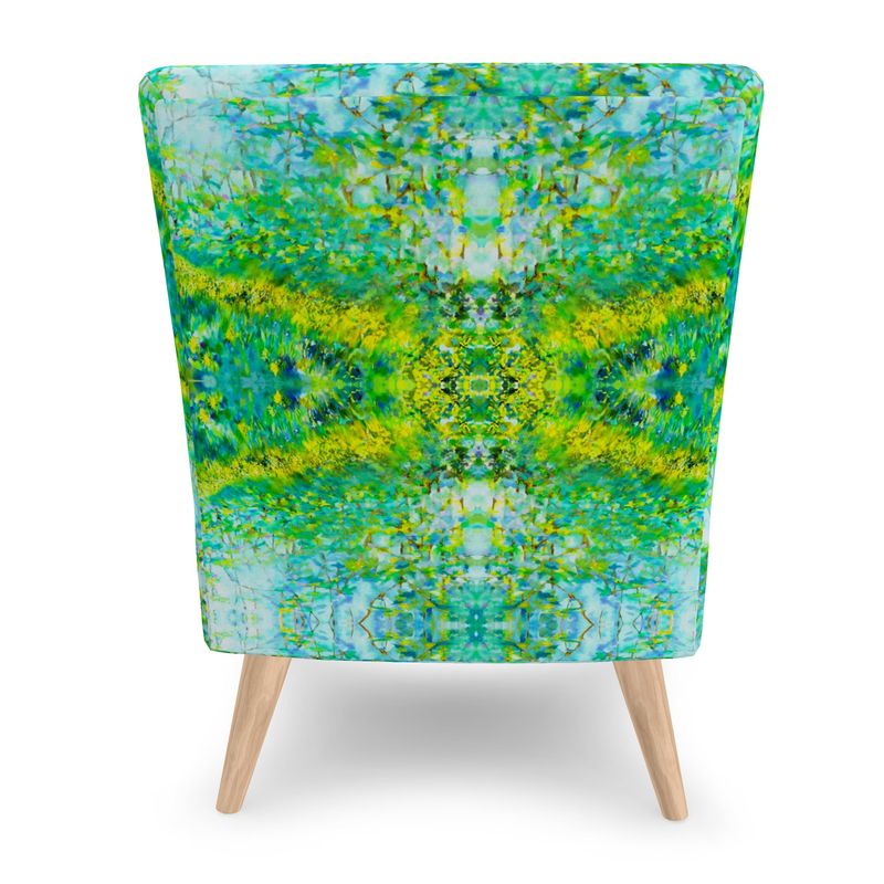 Green chair blue belles design Mirrored imaging to create a funky designer chair Strong furnishing fabric in beautiful 100% fire rated velour Responsibly sourced beech wood 74 cm by 63 cm by 49 cm Handmade to order in UK Surface wipe clean only . Clean gently by hand with mild soapy damp cloth