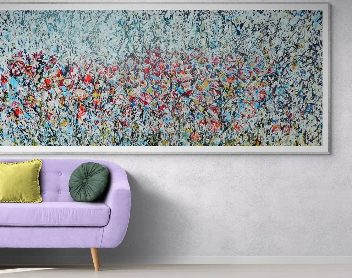 Measuring approximately 121.92 x 50.8 x 2.54 cm (48 x 20 inches), Wild Poppy Meadow is gallery wrapped and ready to hang. Whether placed in a modern home, creative workspace, or curated art collection, this original painting delivers colour, movement, and contemporary artistic presence.