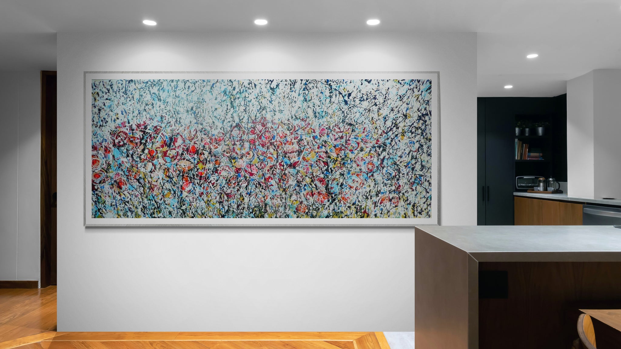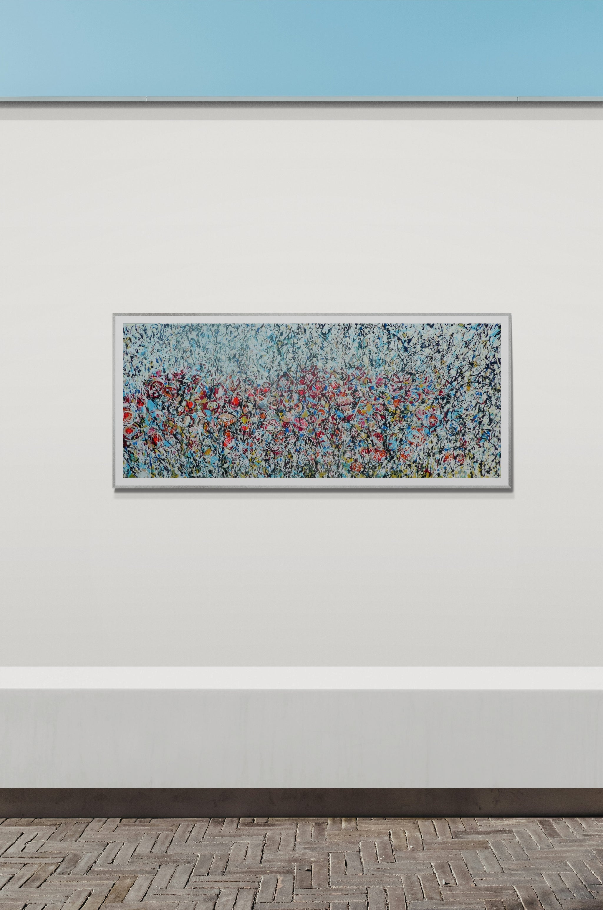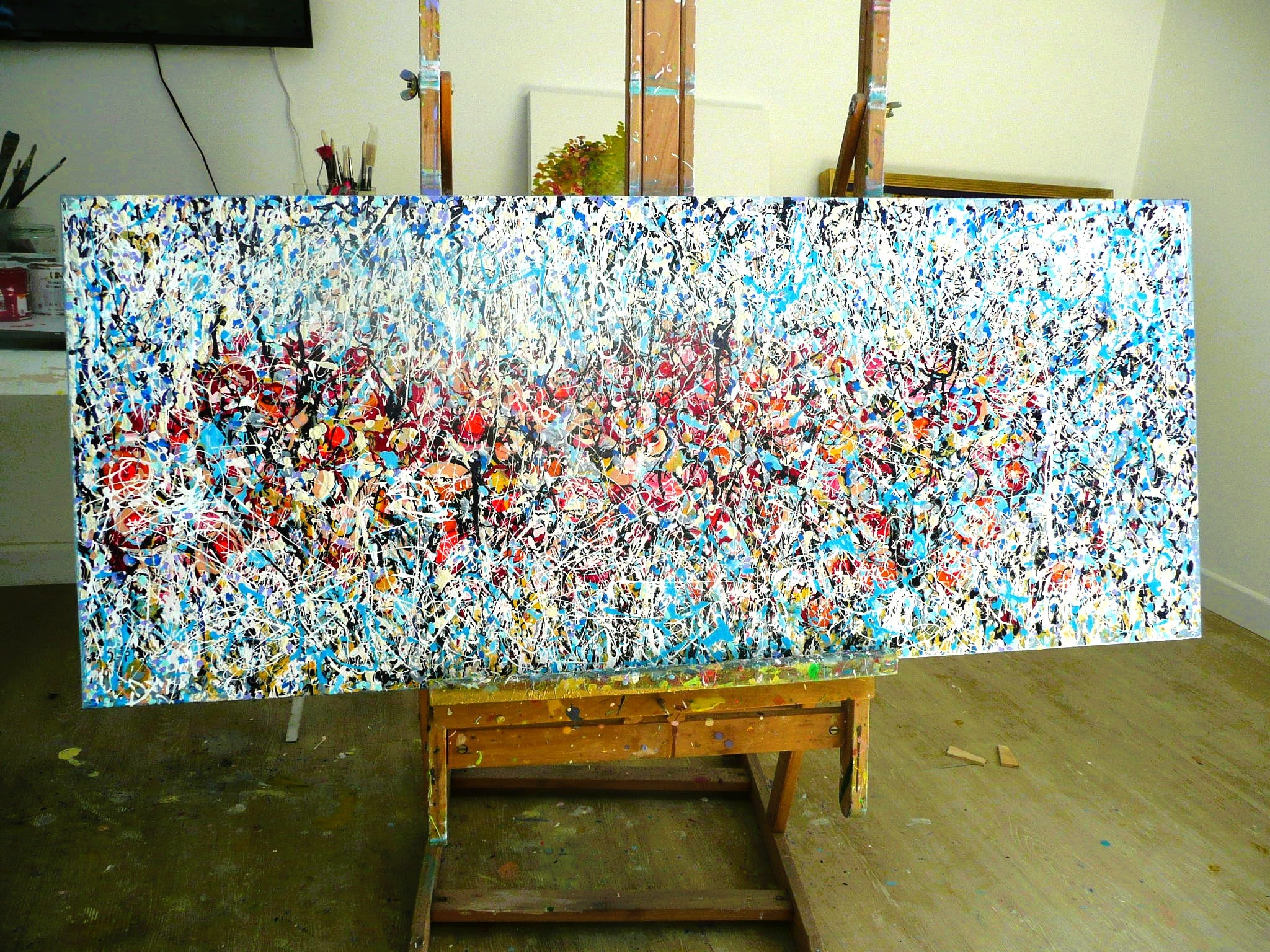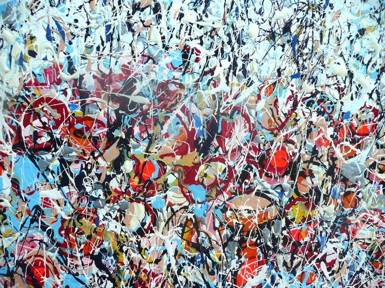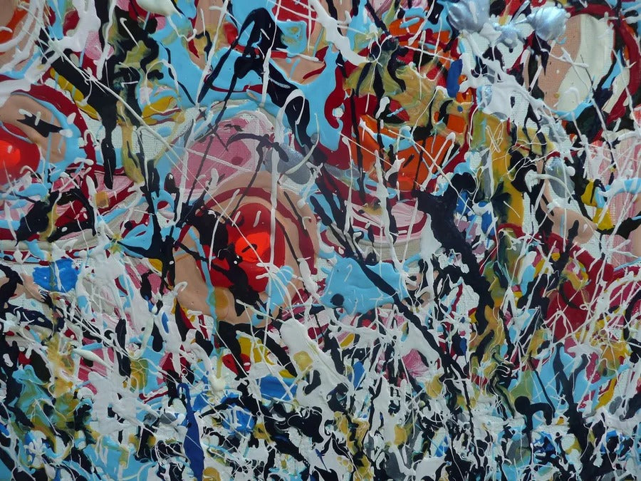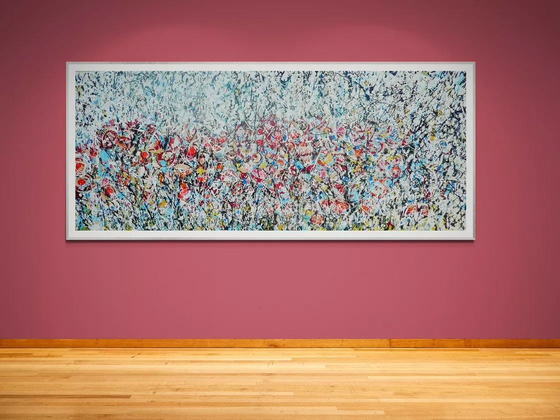 Painted using acrylic and enamel on a slim-profile canvas, the work employs a sophisticated drip technique inspired by Jackson Pollock. Layers of crimson red, deep blue, crisp white, and bold black interact dynamically across the surface, creating rhythm, texture, and depth. The flowing marks and splashes evoke the natural chaos of a wild meadow in bloom.