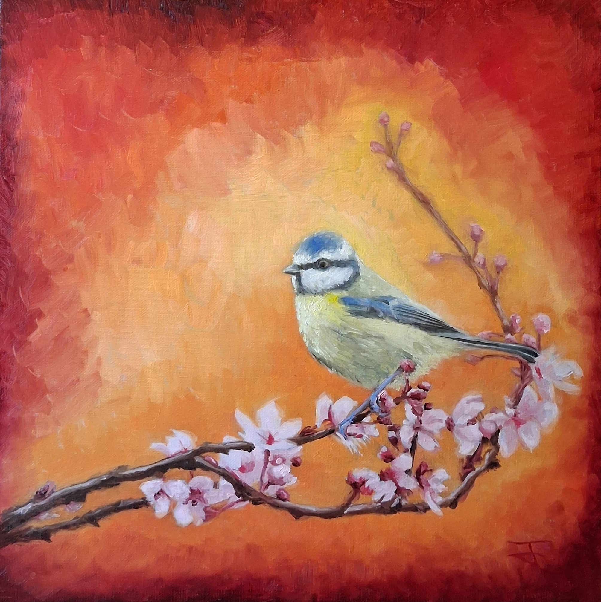Expressive brushstrokes and bold color choices bring the composition to life. Fiery reds and warm oranges flow through the sweeping branch, contrasting beautifully with the soft pinkish-white blossoms and the fluffy textures of the blue tit’s feathers. The balance of energetic color and delicate detail creates a striking yet harmonious painting.