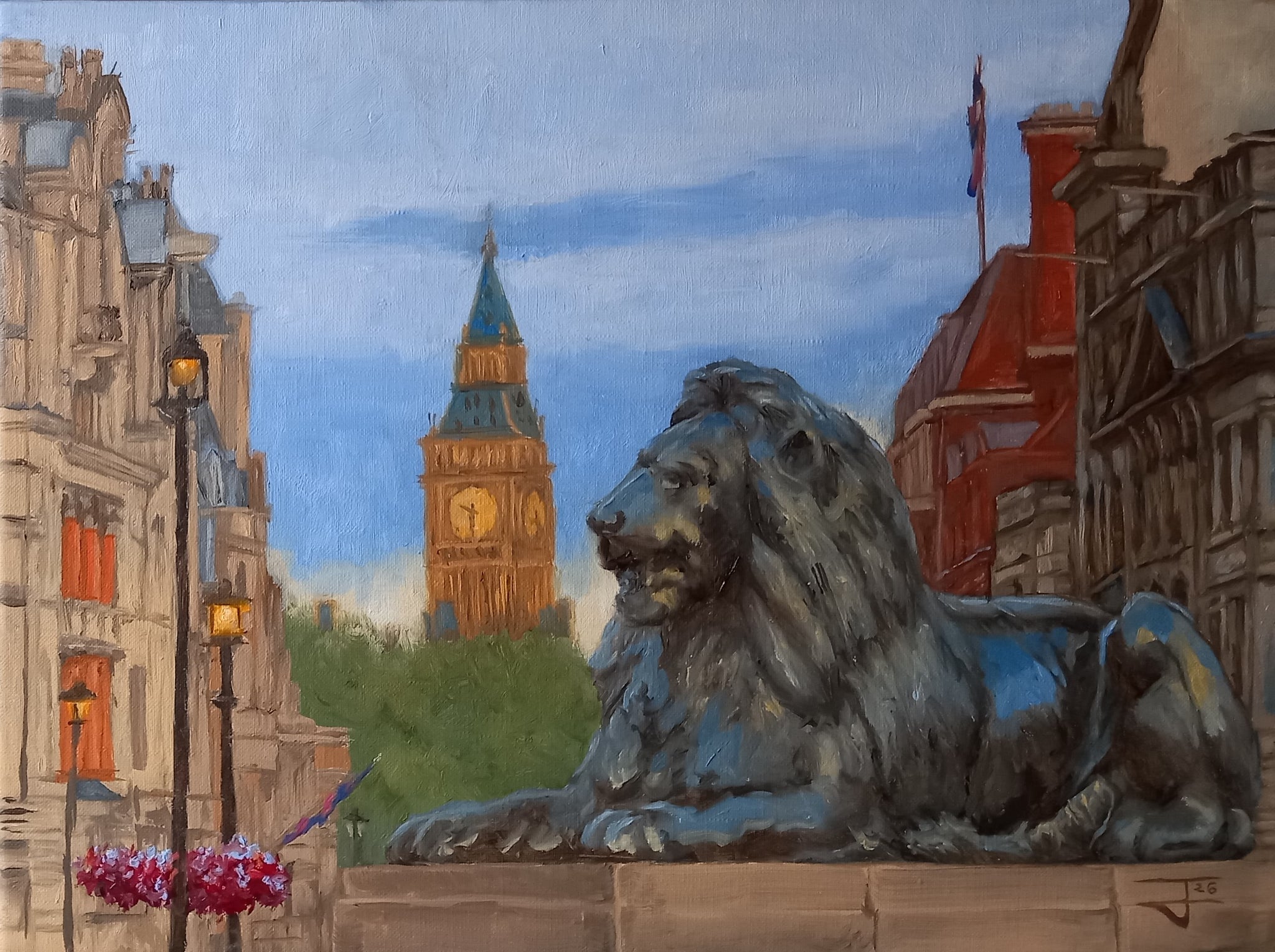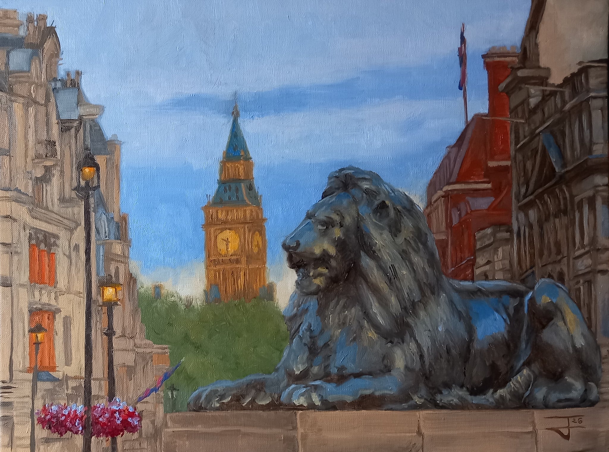 Painted in rich oils on canvas, the scene features the famous bronze lions sculpted in 1867 by Sir Edwin Landseer, anchoring the foreground with strength and tradition. Inspired by Trafalgar Square’s reputation as an open-air art museum, Johnson blends architectural precision with painterly texture, creating a work that feels both classical and alive.