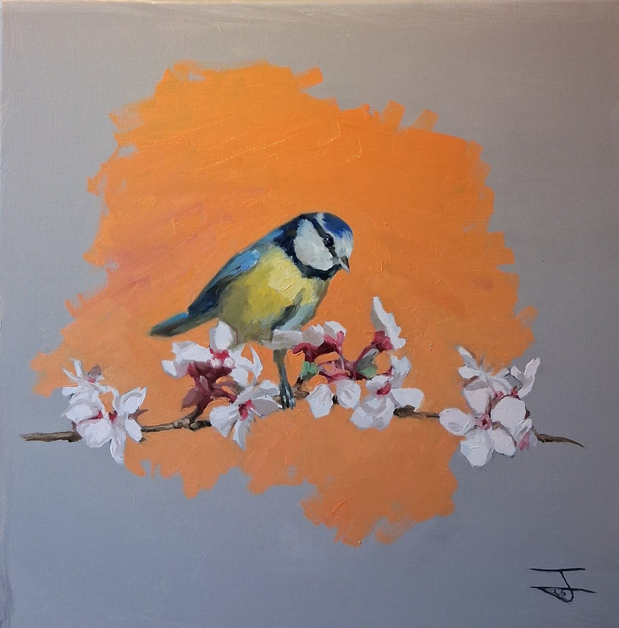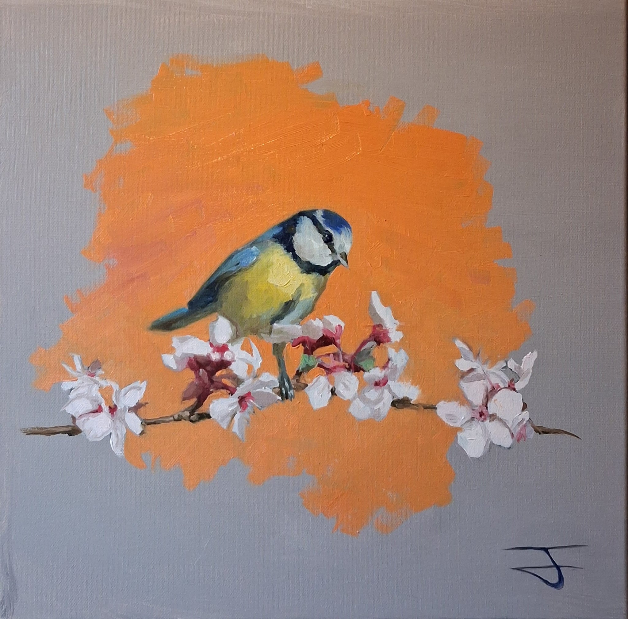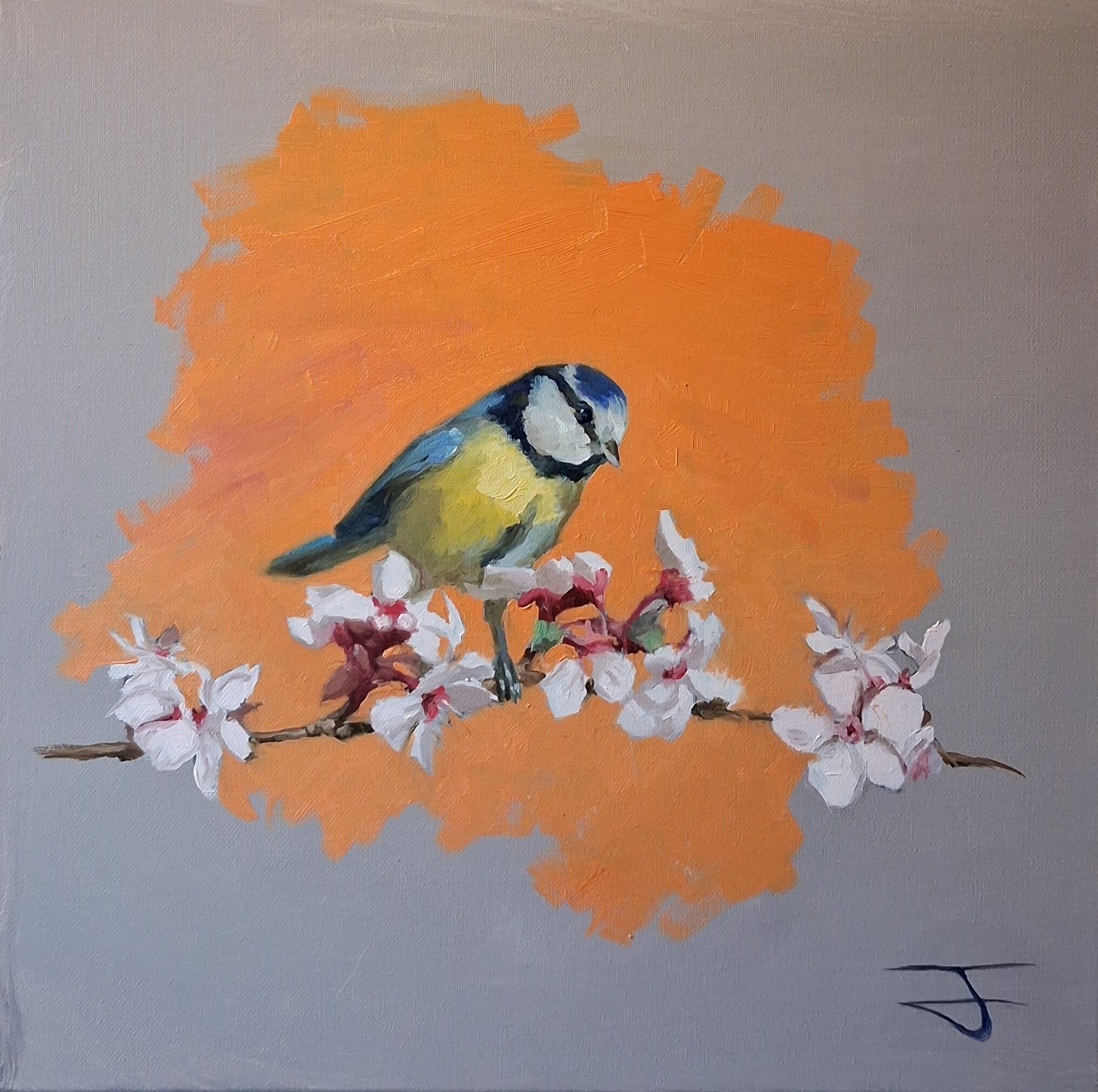 Using complementary colors between the background and the plumage, this piece highlights the striking posture of the bird while maintaining a soft, natural harmony. The contrast between the bright blues and yellows of the blue tit and the gentle spring tones creates a composition that is both bold and calming.