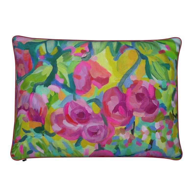Camelia from an original painting by lesley blackburn . Choice of fabrics from soft velvet ,velvet shimmer , Mayfair Herringbone ,Archway twill .cotton linen , Eco gaia woven recycled . Zip can be either plain or heart shaped . Supplied with or without a pad .Pad either poly fibre o feather . Sizes of Cushions 30 cm by 30 cm 12 inches, 40 by 40 cm 16 inches 60 cm by 60 cm 24 inches 50 by 50 cm 20 inches 55cm by 55 cm 22 inches 50 cm by 35 cm 20 by 14 inches choice of piping - unpiped ,white ,black,yellow,cerise .rose or kingfisher blue Wash at 30 degrees 85 f ,low tumble heat ,hang to dry , low heat iron .Quick Worldwide Delivery Ships in 1 to 2 days