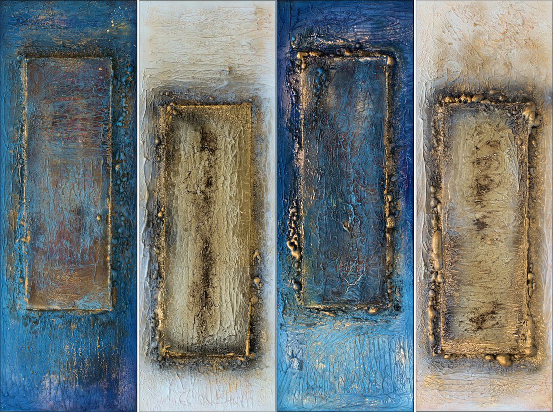 This original abstract artwork by Edelgard Schroer consists of four strongly textured vertical panels that explore the idea of passage, transition, and inner space. Each element is built from two canvases, with a smaller canvas mounted onto a larger one, creating a sculptural depth that goes beyond the painted surface.