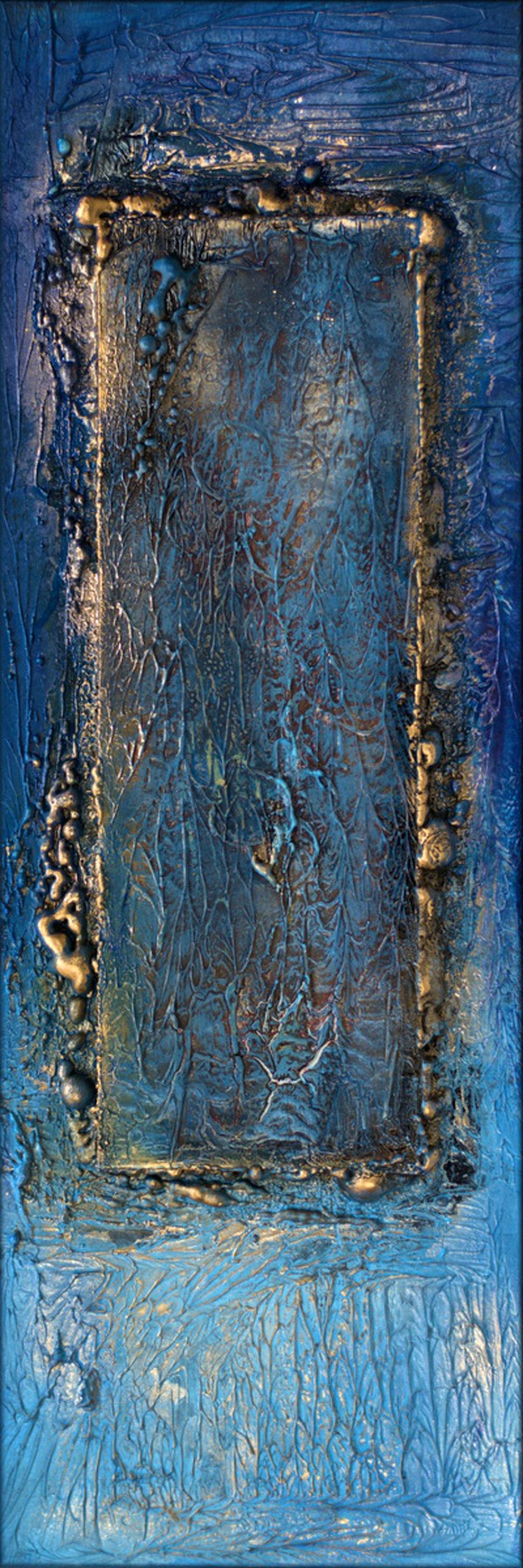 Rich layers of acrylic paint, modelling paste, and metallic gold accents form tactile, almost relief-like structures. Deep ultramarine and ocean blues meet warm sand, ivory, and muted earth tones, while golden borders and organic traces suggest framed inner spaces—doors, thresholds, or symbolic portals. The surface bears visible marks, cracks, and textures that catch the light and change with perspective.