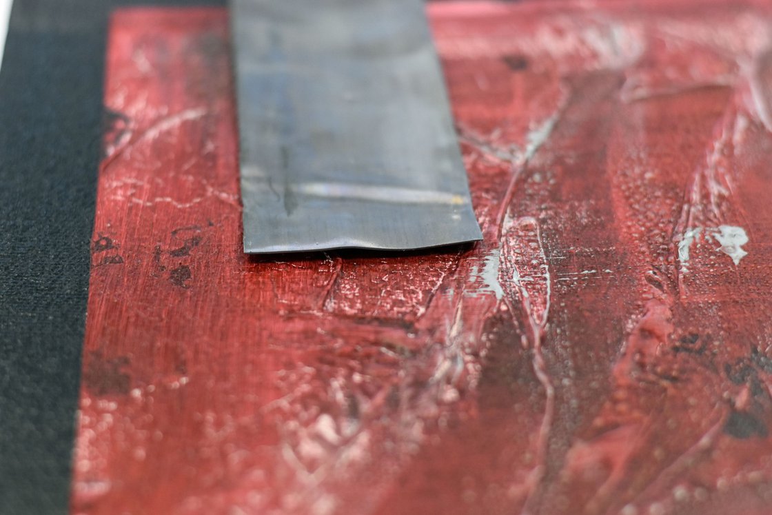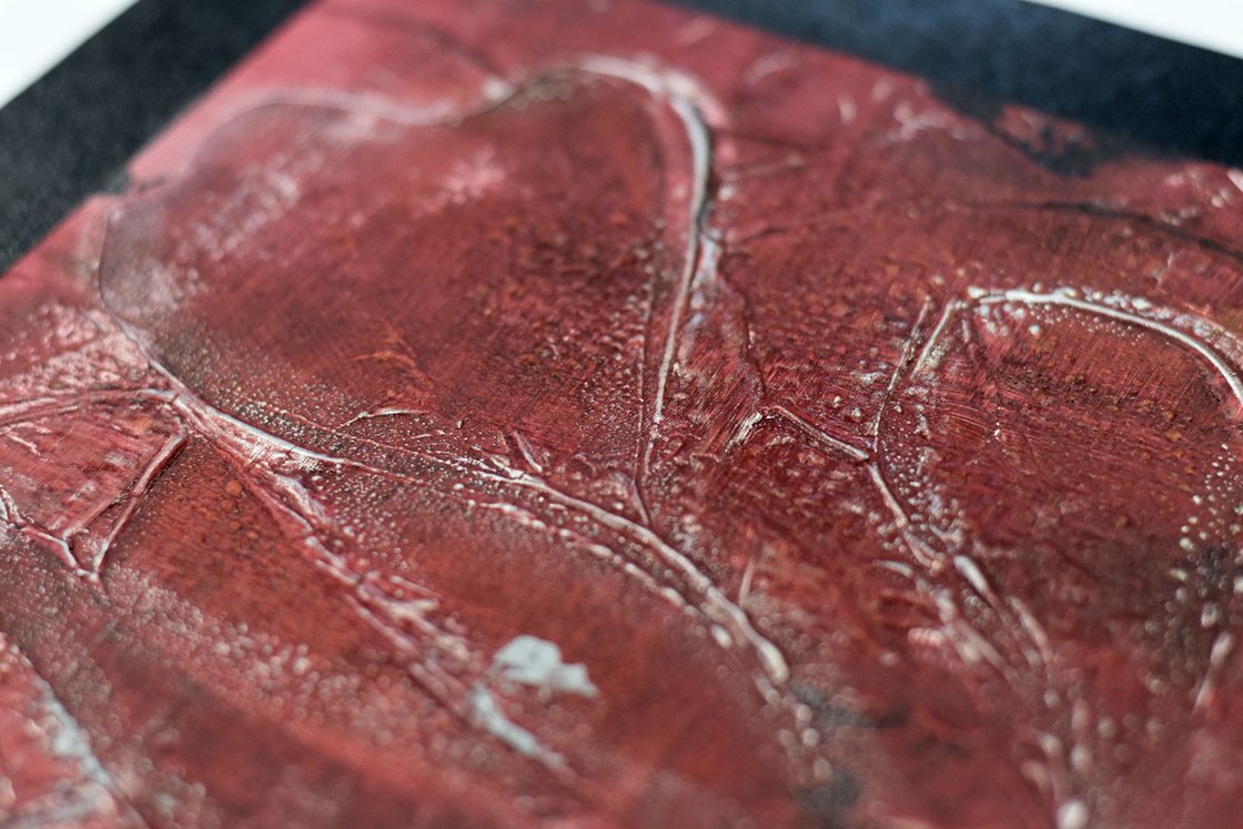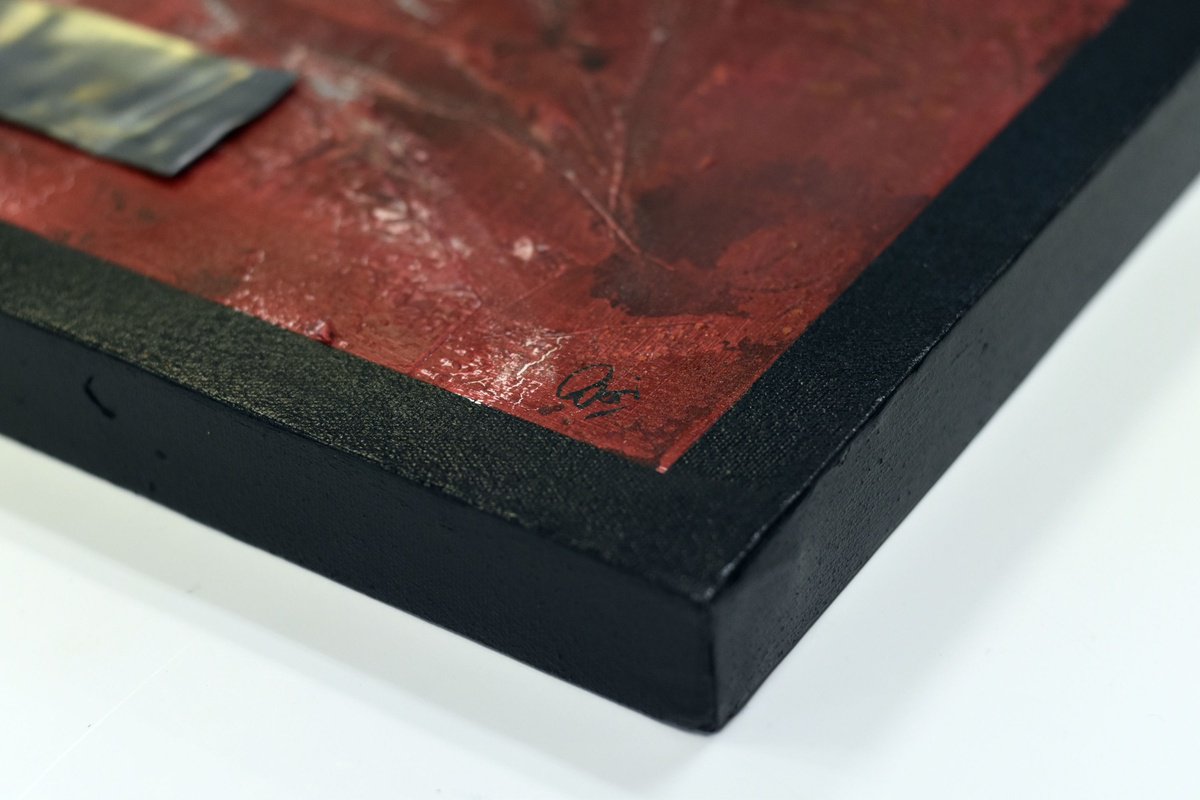 This original abstract painting by Edelgard Schroer combines deep crimson tones with a strong visual presence. A striking metallic inlay breaks through the textured red surface, adding an industrial and sculptural touch. Subtle heart shapes emerge from the thick layers of acrylic paint, their contours emphasized by tactile structures and artistic crackling. The surface is sealed with a matte finish to preserve its vibrant intensity. The painting is signed on the front and comes ready to hang.